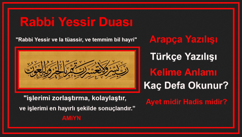 Bir işe başlarken, sınav duası olarak da bilinen, zor, kolay olmayan, müşkilatlı işlerin çözümü, Allah tarafından yardım edilmesi için tavsiye edilen “yardım duası, kolaylık duası “Rabbi yessir” ne demek? Anlamı nedir Arapça yazılışı ve okunuşu, kelime anlamı ve Kuran’dan benzer manadaki ayetler ve dualar