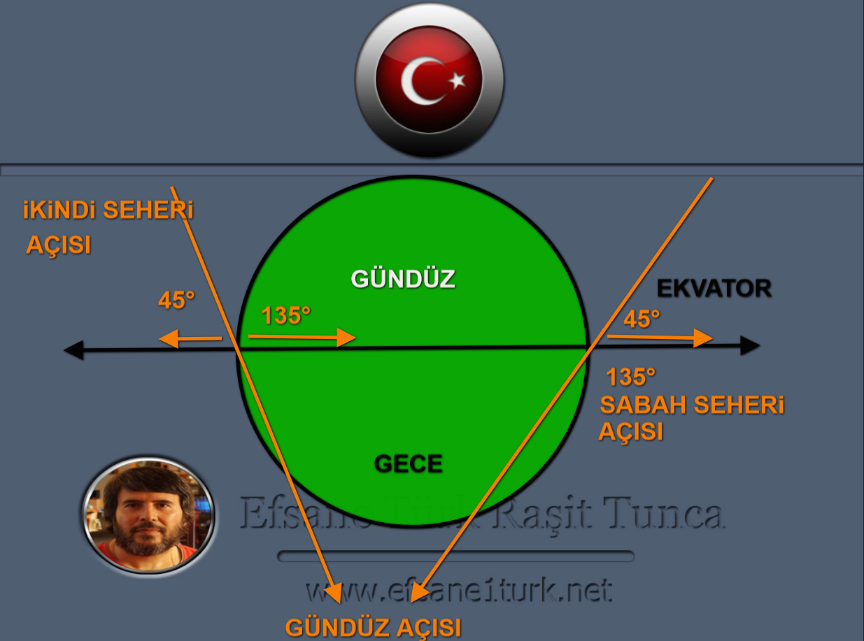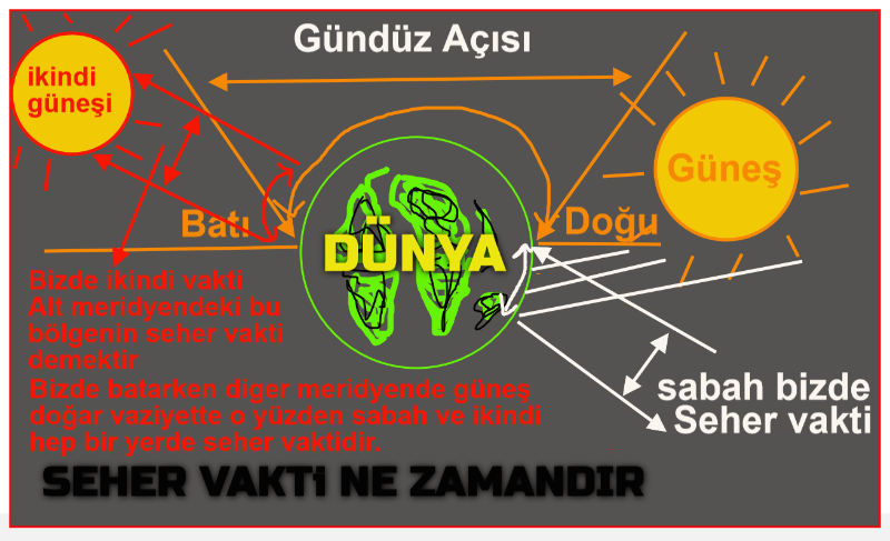 Seher vakti meselesine gelince, çizmiş olduğumuz şekilde gösterdiğiniz gibi, önceki vaazımızda da anlatmıştık, seher vakti iki vakittir : birisi sabah Seheri, ikincisi bizde Güneş batarken, alt meridyede yeni gün doğup ta, gündüz olan taraftaki ikindi seheri vaktidir. Seher vaktini gece olan taraftan hesaplamak zordur, bunun Kolay olan yöntemi ise, merkez, Bizim bulunduğumuz Avusturya/Viyana veyahutta Avusturya/Schrems ele alındığında, buraya bir Merkez noktası koyulup, herhangi bir bölgenin köyün kentin, gündüz açısı ele alındığında, ikindi vakti girdiğinde ki derece, baz alınaraktan, dünya dairesinden bir çizgi ile başlatılıp, merkezden geçip, dünyanın öbür ucuna ulaşan bir çizgi, 180° bir çizgi çizildiğinde, ve yine o bölgedeki Güneşin Battığı dakika ve saatte ki derece ve açı ele alınıp birinci çizgiyi kesip geçen 180° düz çizgi çizildiğinde, yani x işareti yapıldığında, bir ucundaki açı, sabah seher vaktinin zamanını gösterir diğer ucundaki açı ise, Bizde Sabah, yani gece seher vaktinin zamanını vermiş olur.Bbu şekilde anlayabilirsiniz. ikinci bir şekilde de anlattım. Birinc şekilde kafası karışanlar, ikinci şekile bakıp, belki daha kolay anlayabilirler, Yani işte, ikindi seher’i, gece Seherini bulmamıza kolaylıktır.